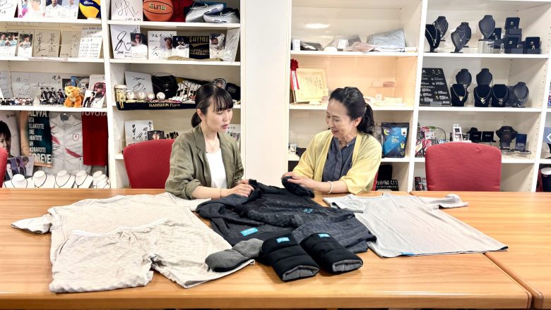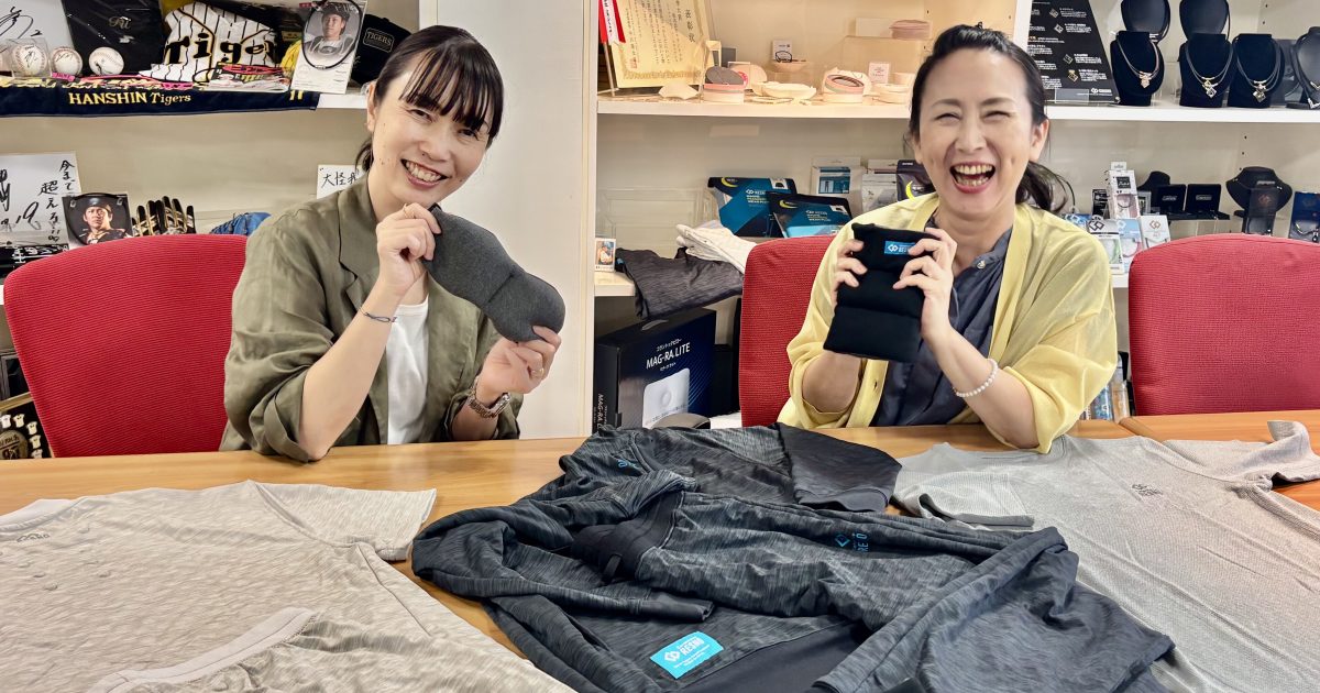 広報担当の中島さん(左)と開発担当の玉澤さん(右)。机の上にあるのが、リカバリーウェアをはじめとする「コラントッテRESNO」のアイテム