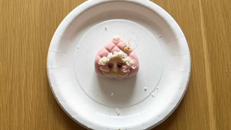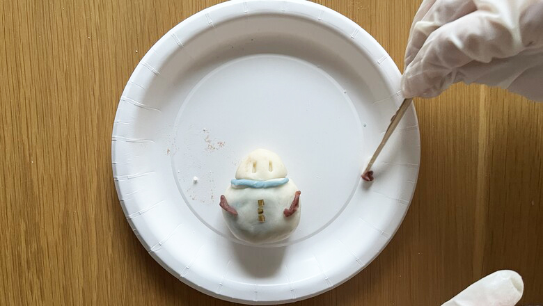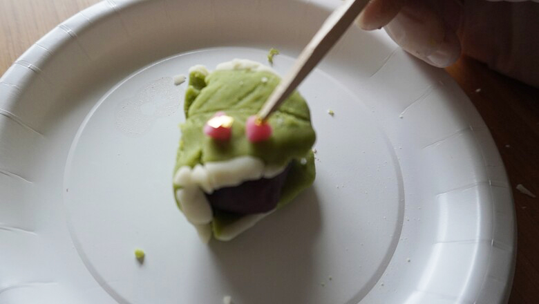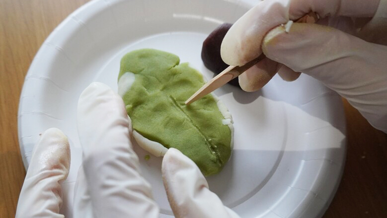 ②ふちに白餡を取り付け、葉っぱを表現します。
