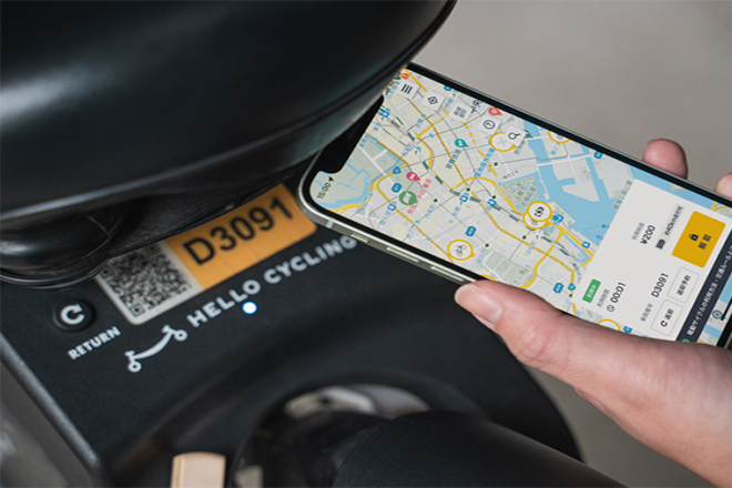 「電動サイクル」を利用するには、まず、OpenStreet(株)の「HELLO CYCLING」アプリをスマートフォンにダウンロードする必要があります。(「電動サイクル」ステーションの看板にある二次元コードからもダウンロード可能です。)
